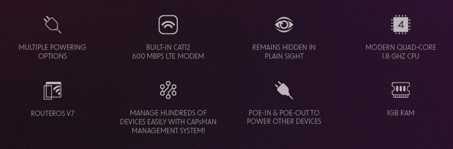 Благодаря мощному четырехъядерному процессору ARM с тактовой частотой 1,8 ГГц, гигабайту оперативной памяти и чрезвычайно гибкой RouterOS v7 в основе cAP LTE12 ax — это гораздо больше, чем просто точка доступа. Она предлагает ряд расширенных функций, в том числе: