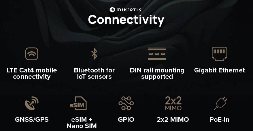 Работает на базе RouterOS – полный сетевой стек, VPN, брандмауэр, управление SMS и уведомления, автоматизация, удаленное управление и многое другое!