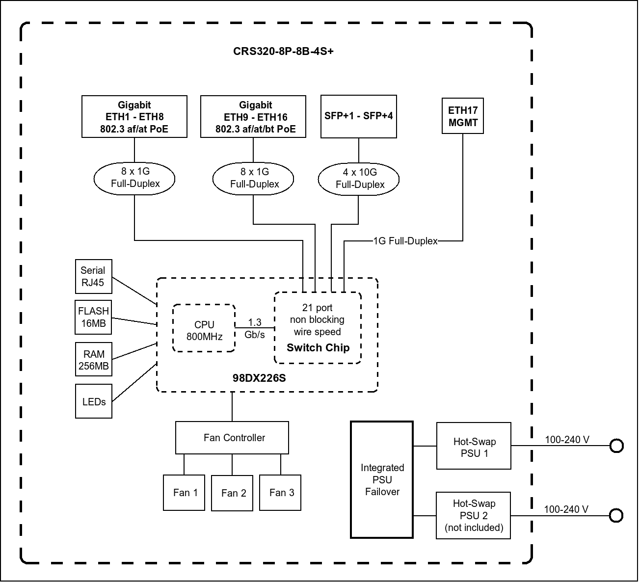 | Питание PoE out | Ether1-Ether8 (af/at), Ether9-Ether16 (bt) |