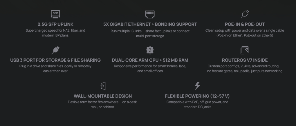 Благодаря 5 портам Gigabit Ethernet (включая PoE-in на порту № 1 и PoE-out на порту № 5), а также 2,5-гигабитному отсеку SFP этот компактный маршрутизатор может адаптироваться ко многим ролям. И в отличие от большинства коробок интернет-провайдеров, вы можете назначить любой порт как WAN, LAN или мост — полная гибкость прямо из коробки. Это только начало. RouterOS v7 предоставляет вам расширенную маршрутизацию, VLAN, связывание, формирование трафика и многое другое — так что вы можете построить проводную сеть, которую вы всегда хотели.