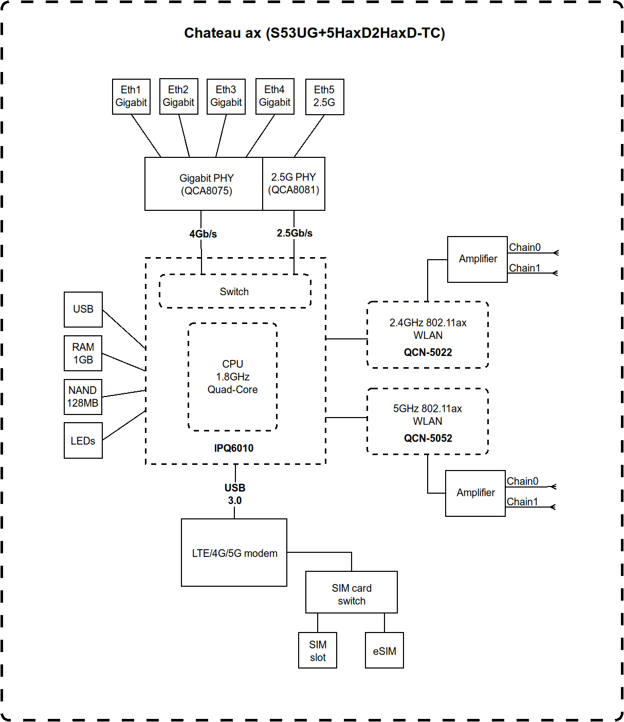 | Wi-Fi интерфейсы | Два: 5 ГГц 802.11a/n/ac/ax MIMO4x4 + 2,4 ГГц 802.11b/g/n/ax MIMO4x4 |