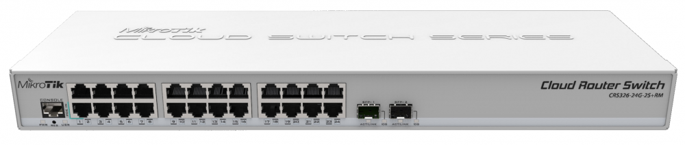 CRS326-24G-2S+RM - производительный (CPU 800МГц, RAM 512) 24-портовый Gigabit Ethernet L3 коммутатор с двумя портами SFP+ c возможностью выбора операционой системы RouterOS или SwOS.